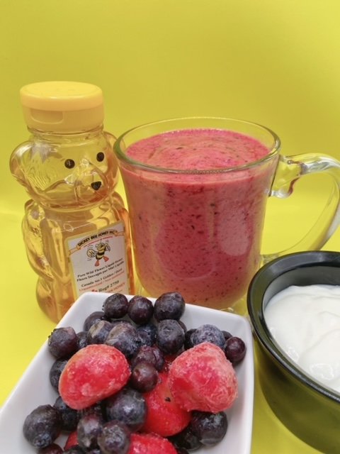 This weeks mouth watering treat is a Berry Blast Smoothy. Made from our brand new Barrie Hill Farms Berry Blend frozen fruit and farm fresh honey( Both are available on our website or in the market). Check it out its a favorite in my home and for anyone that has kids that are picky eaters.